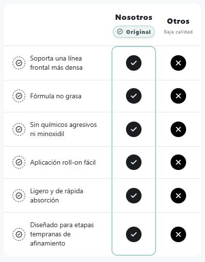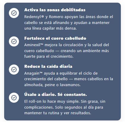 Usamos cuatro activos con evidencia Redensyl®, Aminexil™, Romero y Anagain™, dosificados con precisión para actuar donde inicia el problema en la raíz.