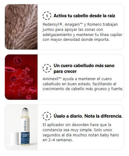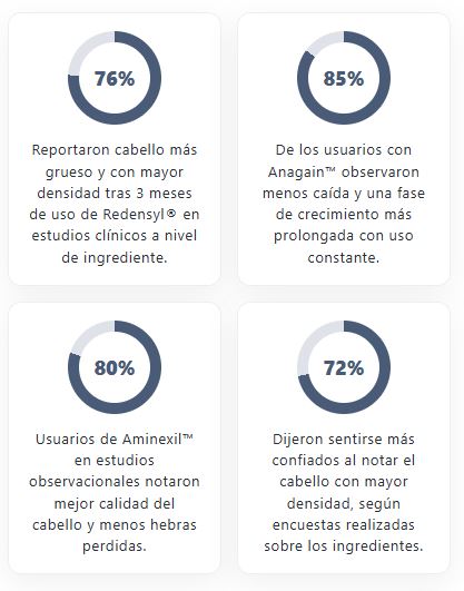 "Los estudios sobre ingredientes clave como el aceite de romero, Redensyl®, Aminexil™ y Anagain™ han demostrado su capacidad para mejorar la densidad capilar y la salud de los folículos en hombres y mujeres con caída de cabello temprana.